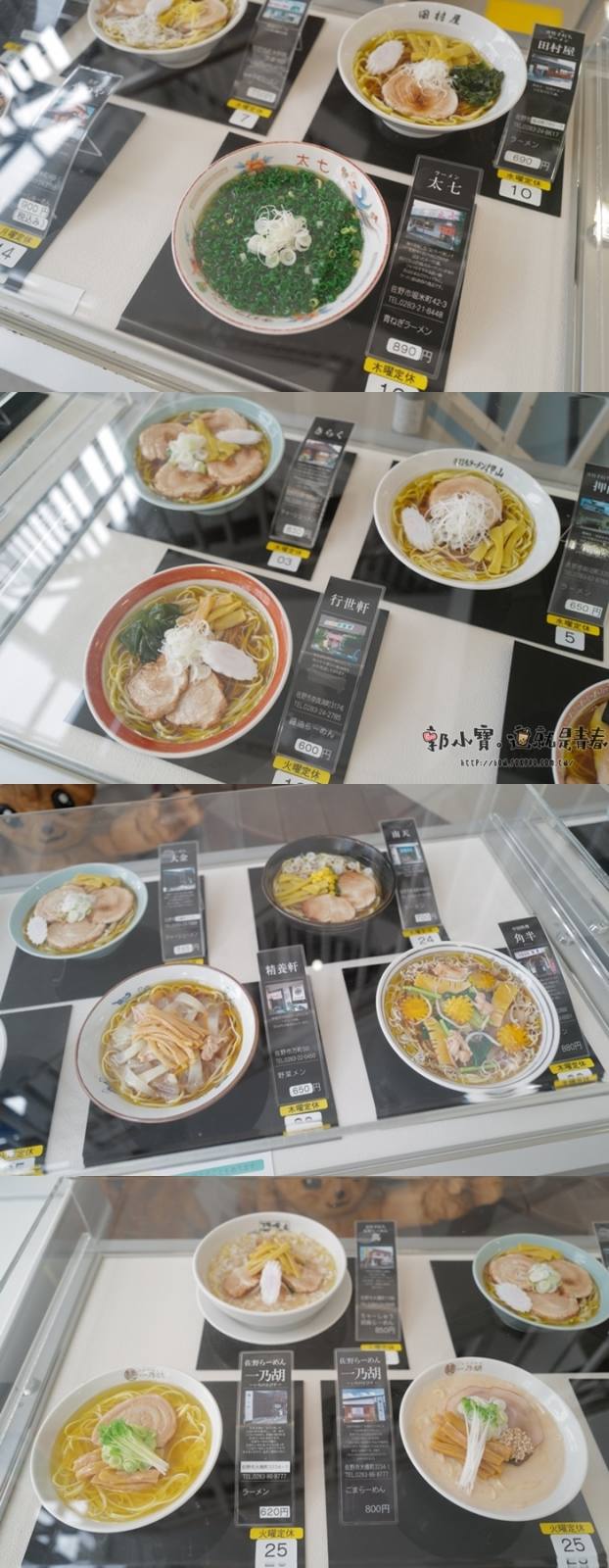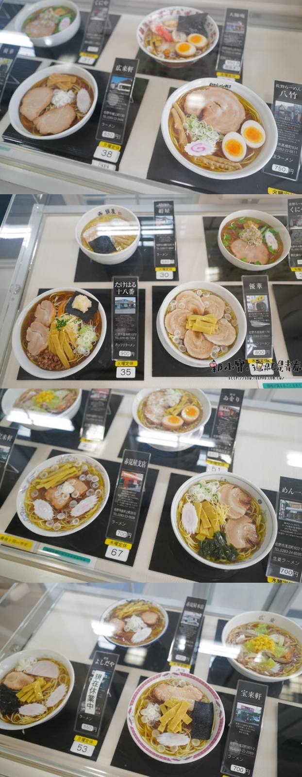 每一家麵店的特色都被以模型的方式復刻出來,可以挑挑看你最想要吃的是哪一家,然後就可以直接出發,但是佐野的拉麵店都很有個性,想要吃你不一定能吃到,我們就是列了很多家想要大吃一頓,結果常常吃到閉門羹,不是指營業早上就是只開到下午5:30,根本就是很不愛賺錢,但也有可能青竹打拉麵製作不易數量有限,所以很早就賣完了,最後我們在佐野也只吃到兩家麵店,都是很有名的老店!