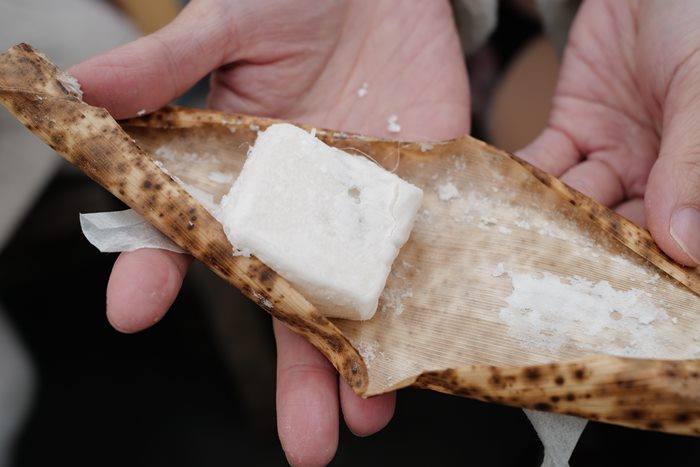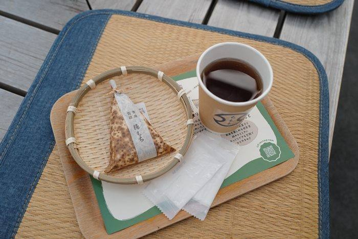 湯もち使用天然竹葉包裹著,看起來有點像是粽子,湯もち是極其柔軟的糯米(求肥)製成,口感介於棉花糖與麻糬之間,輕盈且入口即化。