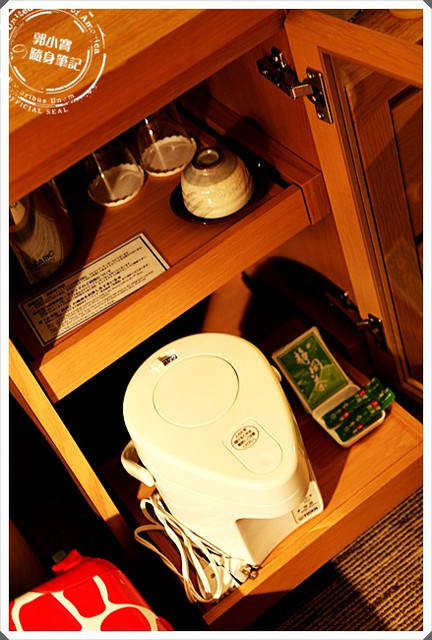 電視櫃下方有茶具組跟一個熱水器,水要去廁所裝,日本的水都很乾淨的,