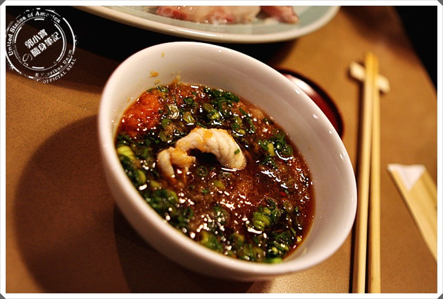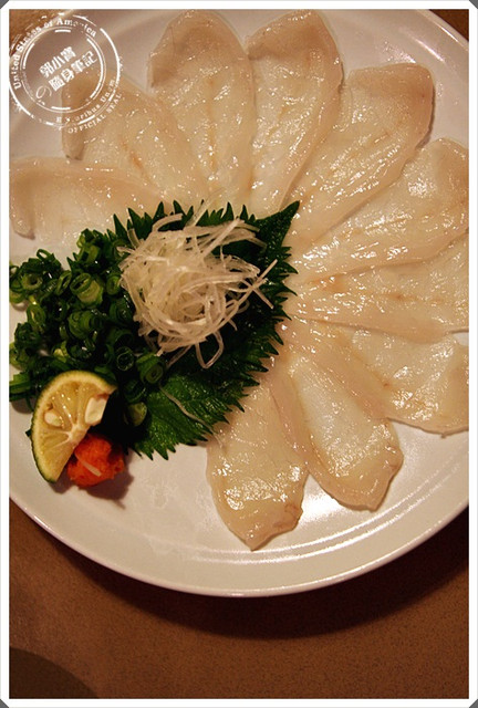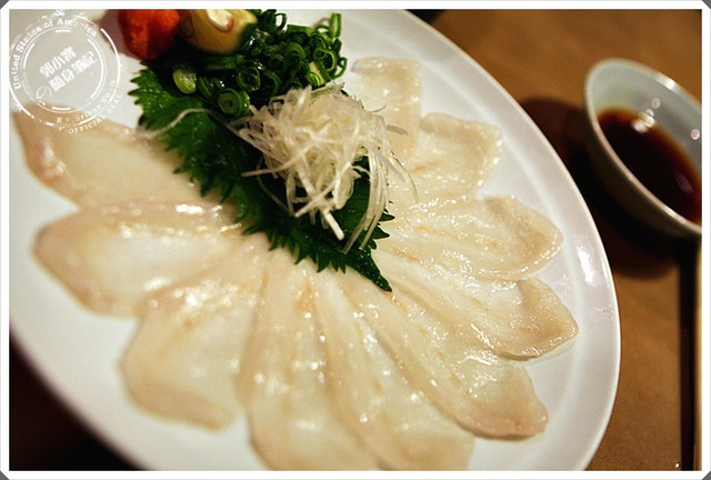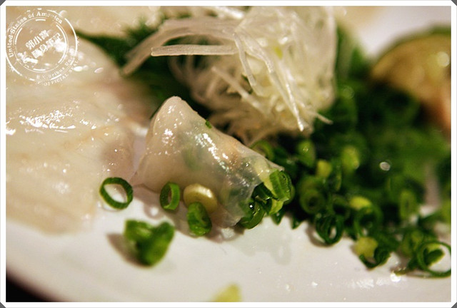 可千萬不要夾著刺身就往嘴裡塞了,先擠上一些檸檬在刺身上,再將蔥花撲在刺身上然後捲起來,沾些許醋醬, 保證你大呼過癮,魚肉本身沒有太大的魚味,但是口感上的呈現一樣是一般刺身沒辦法表現出來的, 醋醬的酸味分泌的唾液讓魚肉鮮味夾雜的蔥花整體整個大加分,加上河豚刺身本身魚肉的口感特別, 整個就是與河豚大餐相見恨晚,真枉費我還在日本呆過語文學校,那段時間怎會沒有狂吃河豚大餐了, 我現在就非常確定我會很想念河豚餐。