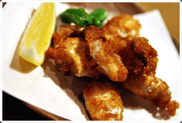 第三道上場的是炸物,利用河豚本身較多肉的地方,加上玄品自製的麵下去微炸, 本以為口感會是厚實的魚肉,但卻又讓小寶驚訝了,一口咬下理面是有點空的, 但是口感的呈現上卻又是很像吃了很多膠質的口感,半黏狀的口感很妙, 加上薄粉微炸整體搭配真的也很好吃,搭配個青椒更顯得豐富許多了。