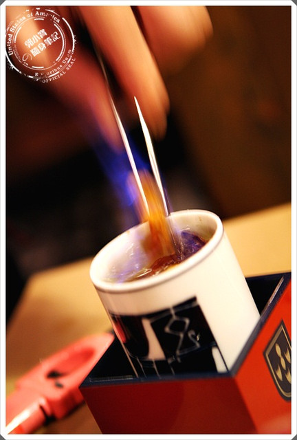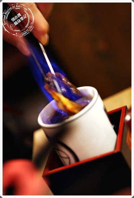 服務人員把河豚魚翅浸泡過清酒後,點上火後再持續在清酒杯裡來回,真的是讓大開眼界。 |