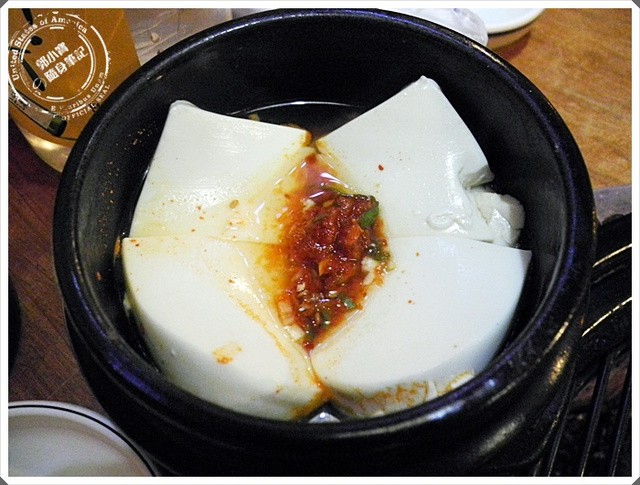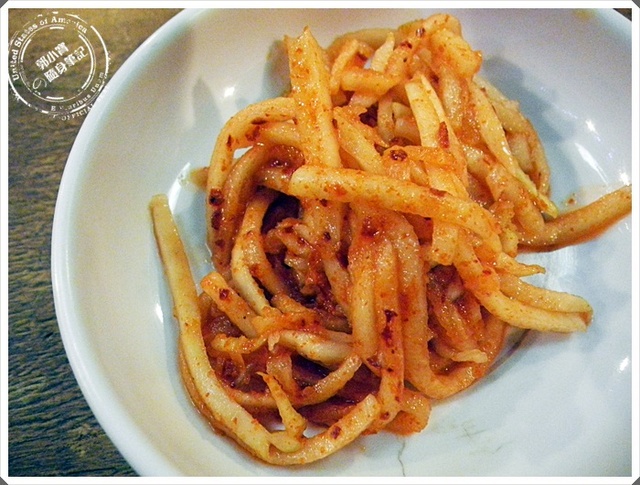 用餐前先送來的小菜一碟,辣蘿蔔乾,我現在很還念韓國的小菜。 |