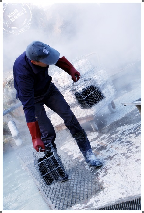 看到工作人員忙錄的將雞蛋放在高溫的溫泉池中,過一下子拿出來就黑了,