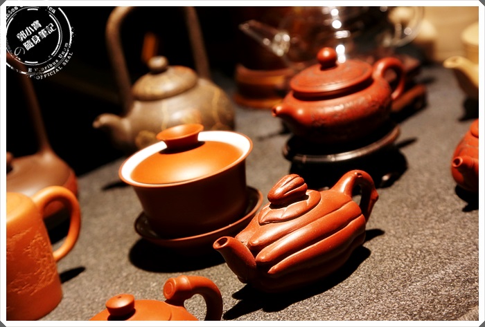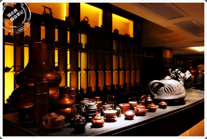大廳中的茶桌擺設了一整套的茶具,旁邊的木牆上也收集了很多茶壺,古色古香。
