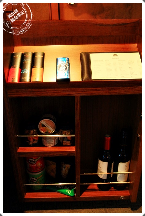 電視櫃兩側都有巧門,翻開來分別是杯子跟零食架,餅乾零食都需要另外付費的,