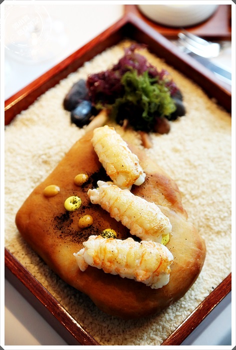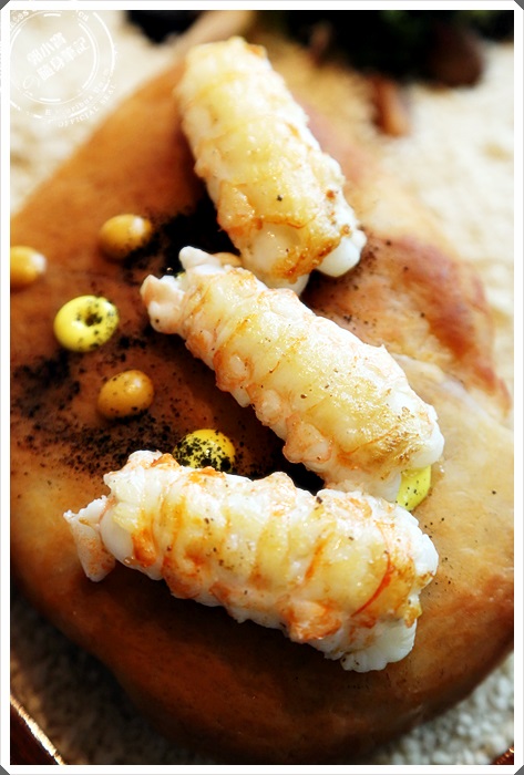 接下來是鹽盤小龍蝦,底下的石頭是鹽岩,放在鋪滿小石子的方盤理,