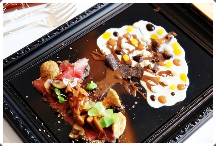 還是一幅3D立體的畫,薄鐵板飽有餘溫,鋪上各種菌菇及風乾薄肉,巧克力繪出樹幹,