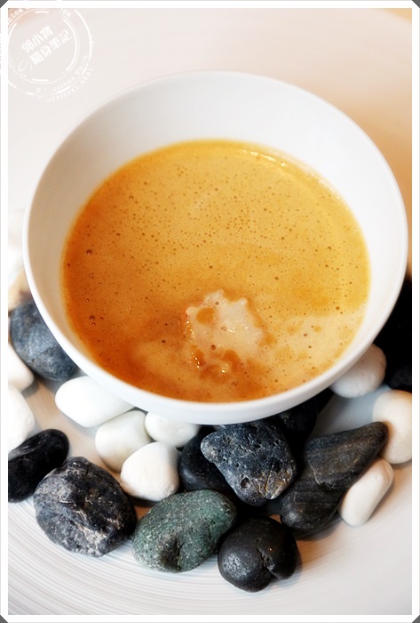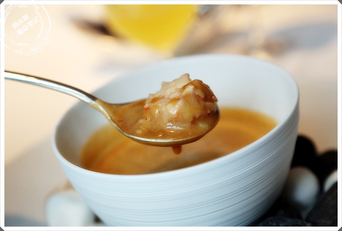 龍蝦湯中還有大塊的蝦肉,湯品喝起來相當的濃郁淳口,有著滿滿的蝦膏味,