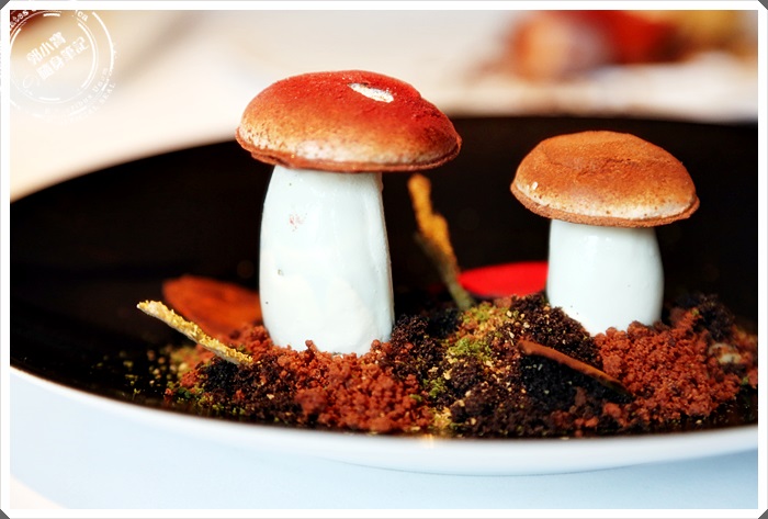 用白色脆皮雪糕做出蘑菇的樣子,灑上大量的提拉可可粉,造景初森林感,