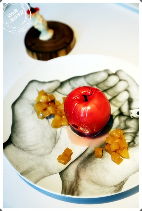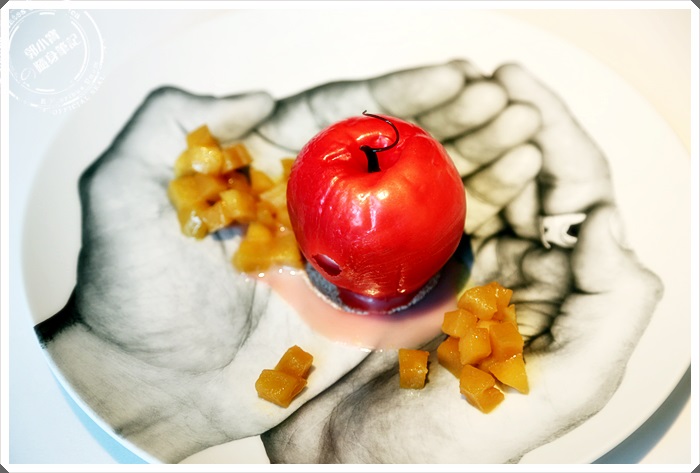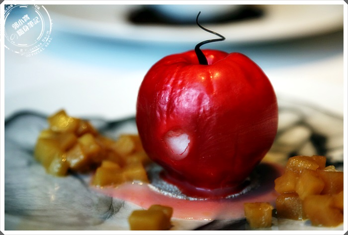 一旁放著醃製過的蘋果切丁,紅艷四射的蘋果冰淇淋,完成後外皮上些糖霜增加它的色澤,