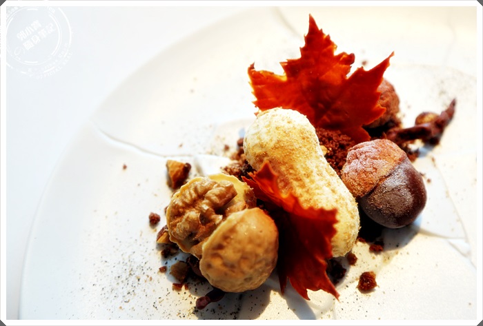 花生、核桃、栗子三種造型的冰淇淋,放上楓葉更添森林氣息 |