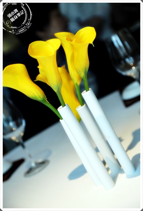 桌上的花朵綻放著,五根立管不是固定式的,服務人員在餐與餐中間都必須收起來從新換上。 |