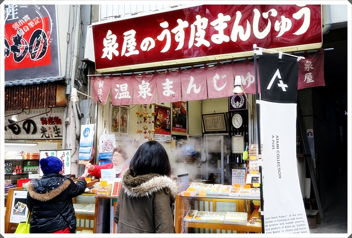 這邊不管賣什麼名產,每一家門口都會擺上了一個方型蒸籠,販售溫泉饅頭!! |