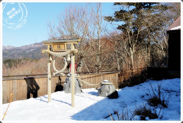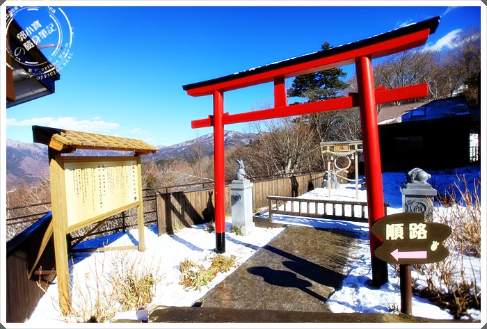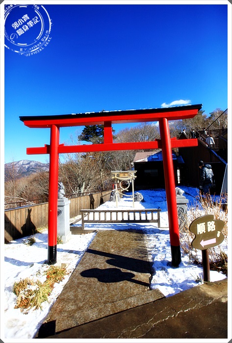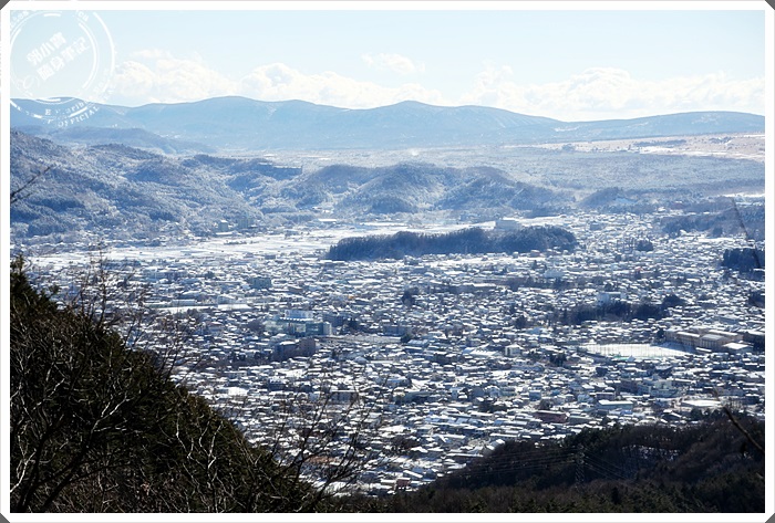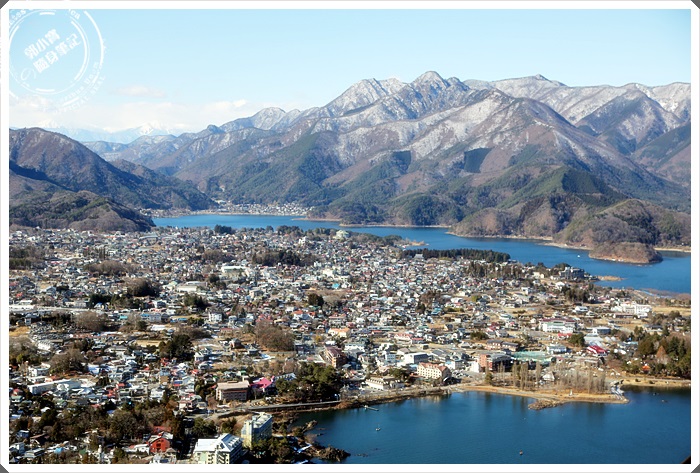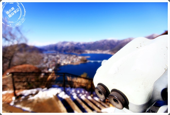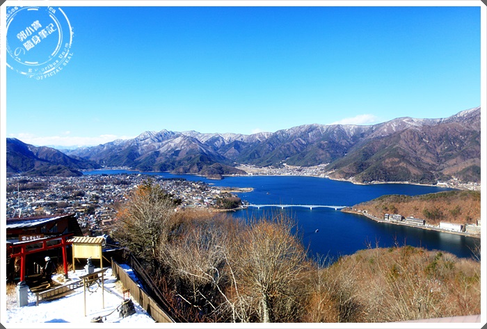 隨著纜車慢慢的爬坡上山,就可以眺望大概整個河口湖的風貌,河口湖這邊還是艷陽高照,但是另一邊山中湖的部分卻是一片雪白世界,白茫茫的一片也是非常的漂亮。 |
