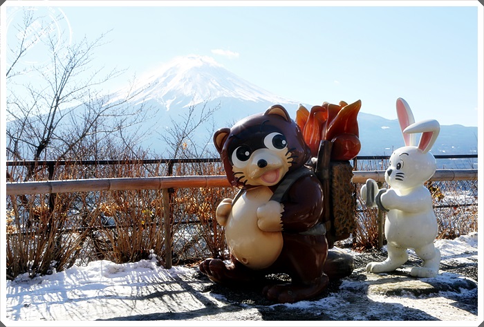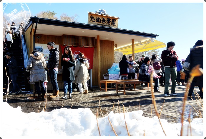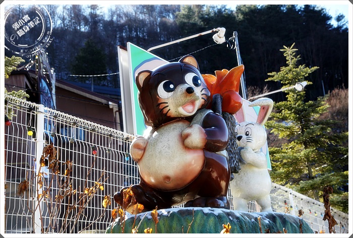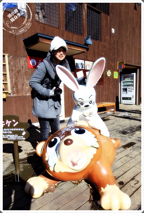 纜車站周圍都有狸貓跟兔子的公仔造型,都做得超可愛的,所以也是很多人爭相拍照的地方,當天太陽起了個大早給我們一個好天氣,但是下過雪大太陽天氣似乎又更冷了一些。 |