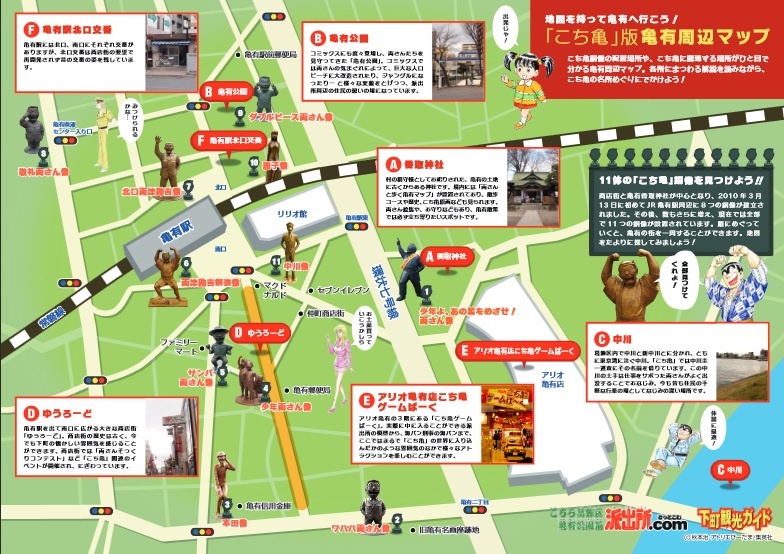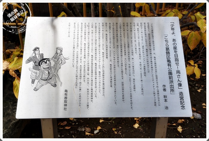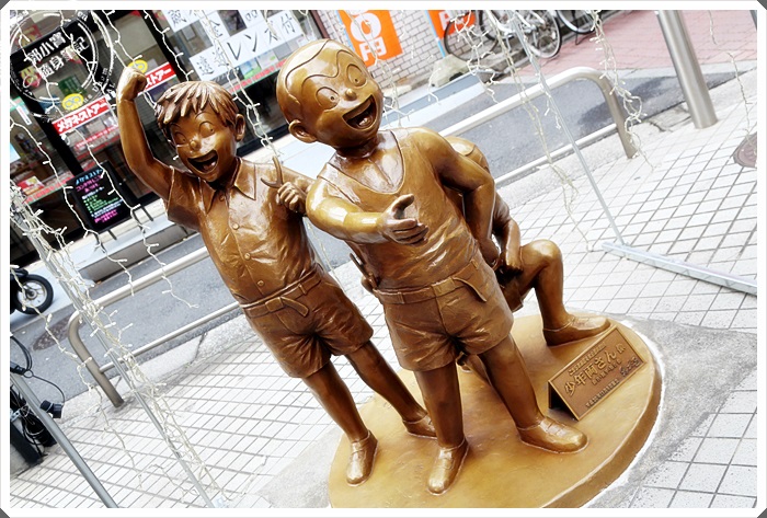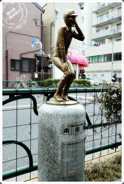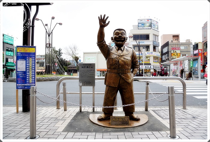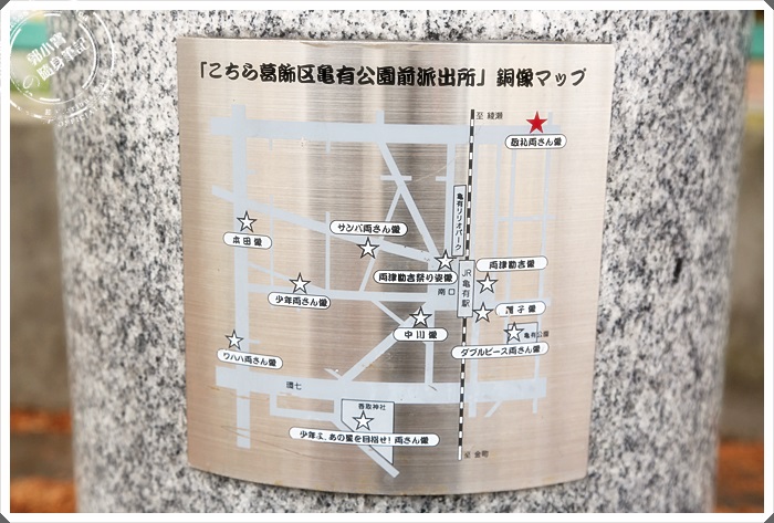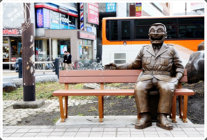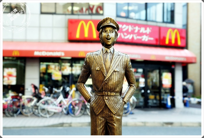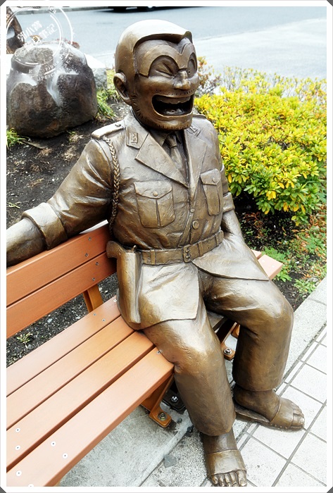 北口一出來除了警察局以外,就可以看到一尊1:1做出來的兩津勘吉銅像了,也是最多觀光客跟他合照的一尊銅像,帶著她的招牌笑容在跟每個來往的客人打招呼中,不過這也是唯一一尊有圍起封鎖線的銅像,其他的銅像就都沒有圍了。 |