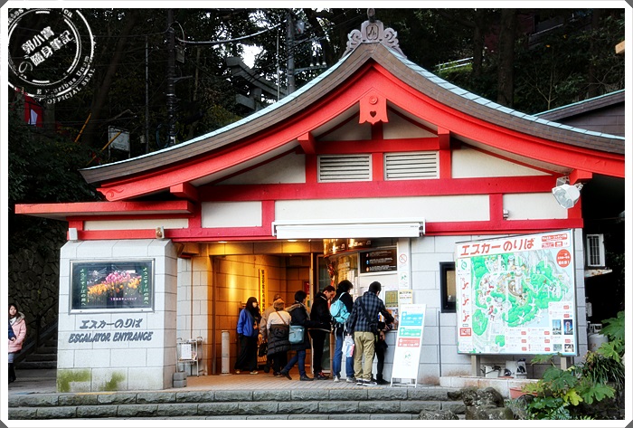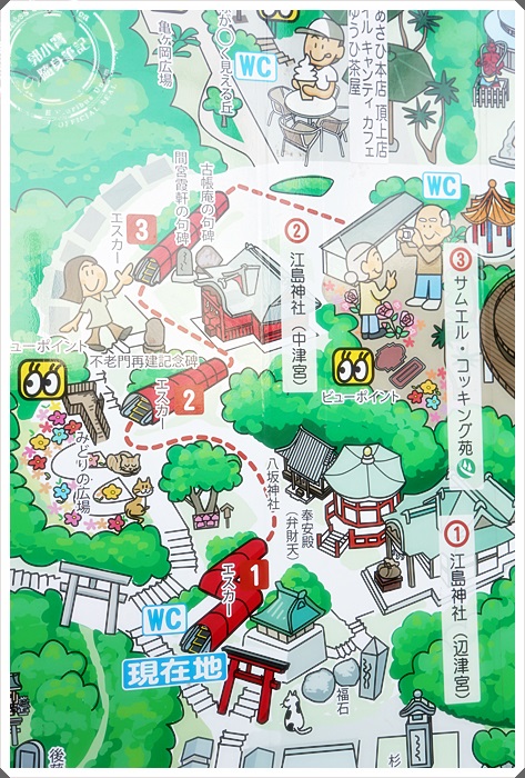 一旁的圖示清楚的話出來,江島神社全部大概分三層,要上山頂看夜燈可能要搭層三部手扶梯,所以當下我們就決定買票搭乘手扶梯了 |