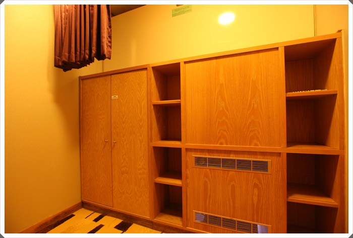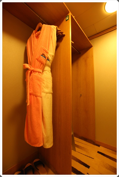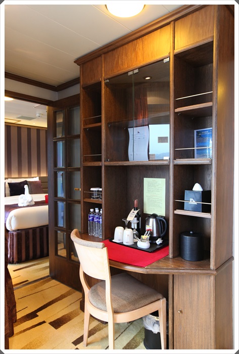 茶水櫃就是獨立的一個櫃子,踩著地上的地毯很舒服,冰箱在電視櫃下面,這邊是單純的茶水櫃,放置的茶桌跟咖啡器具,還有提供一瓶紅酒,這小桌子也是我打電腦的地方。船上的網路速度雖然不快,但是在這本來應該毫無網路的海上,能有網路看一下臉書我就感動到痛哭流涕了。 |