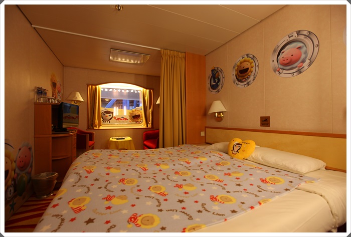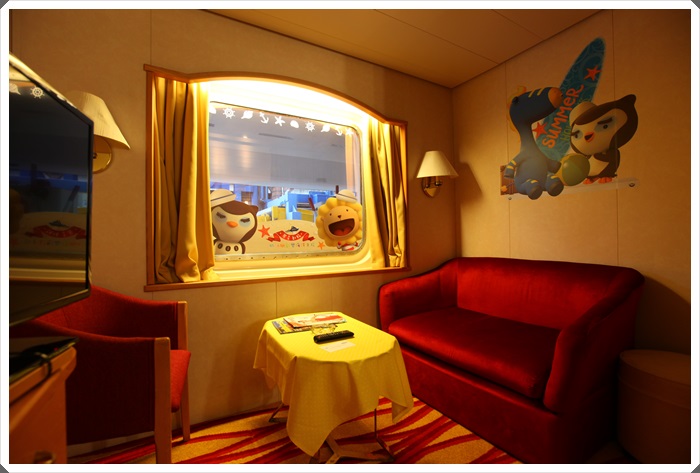 超級適合小朋友親子家庭一起入住的,重點其實這是三人房,紅色沙發是沙發船,小朋友睡起來剛剛好,話說麗星郵輪整艘船空調都超強的,而且通道跟公共場合的冷氣更強,所以記得帶個長袖的襯衫或是小外套,出房間的時間可以套著一下。