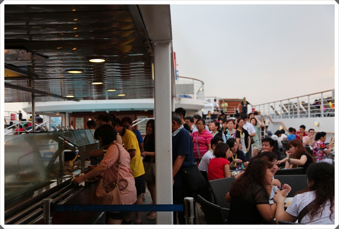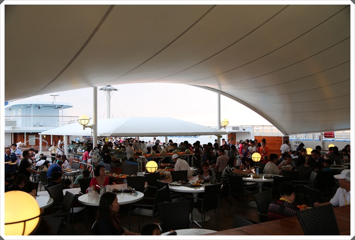 在12樓的奧珊娜燒烤有點像是露天的BBQ,如果第一天晚上天氣好的話建議就先上去吃看看,因為只要天氣不好或是下雨的話,奧珊娜燒烤區就不會開放,順便看一下每次用餐時間一到的人潮就知道有管家的重要性了,幾乎是一位難求啊!! 不然就是要等到有人吃完離開座位,就算離開座位了還要排隊取餐超麻煩的,但是如果有管家的話就超方便的@@ |