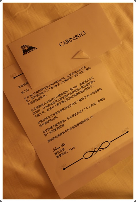 每天晚上房門前都有管家給我們的信,裡面都是隔天的重要事項提醒,好貼心的管家啊!!! |
