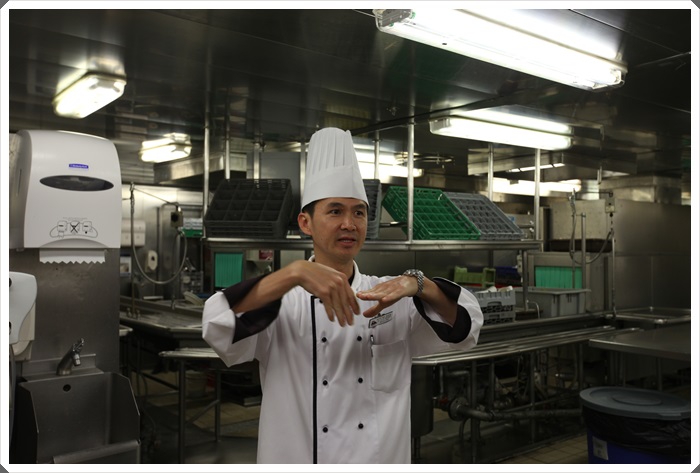 還參觀了寶瓶星號的廚房,我必須老實說我從沒看過那麼大又那麼乾淨的廚房,真的打掃得一塵不染,瞬間感覺他比我的房間還意乾淨,怎會乾淨到這種地步,每餐要煮1500人份的餐點,真的非常的配服它們,這個活度還有教我們怎麼做簡單的泡菜跟現場吃到師傅現烤的餅乾,真的是超級幸運。 |