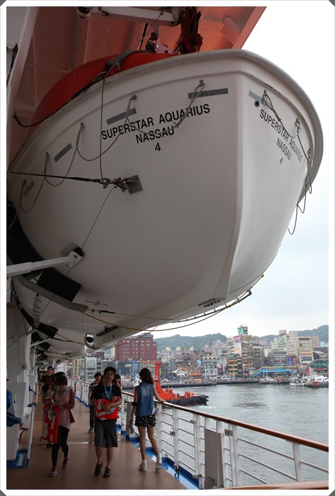 等到大家都上船後,第一件事就是集合全船的遊客參加救生導覽說明,每個房客都有固定的集合地點,不僅教導你如何穿救生衣以外,還教導了許多求生技能,就差沒把救生艇放下來讓我們做看看而已,每個樓梯跟通道都有人指引你前往妳的集合地點,老實說剛上船的時候要是沒人指引的話,一開始真的會搞混方向,因為寶瓶星號真的太大艘了,並不是每一層樓都可以船頭直通船尾的,如果要走船頭直通船尾的下,要下到8樓以下的樓層,大部分8樓以上的樓層都有休憩的空間,很難一路筆直的從頭通到尾。