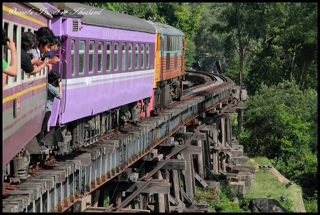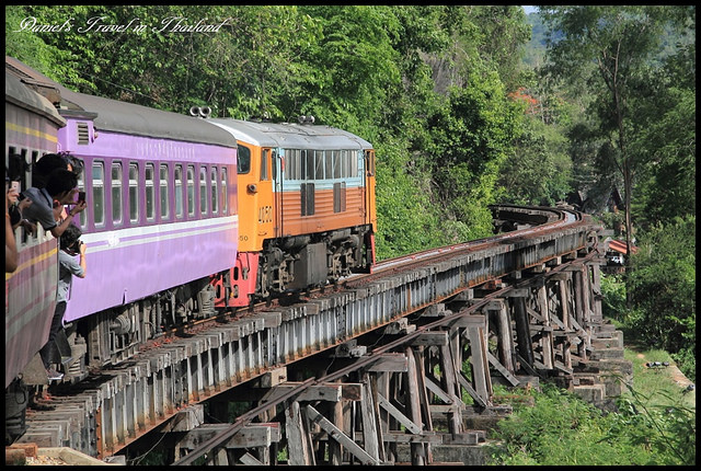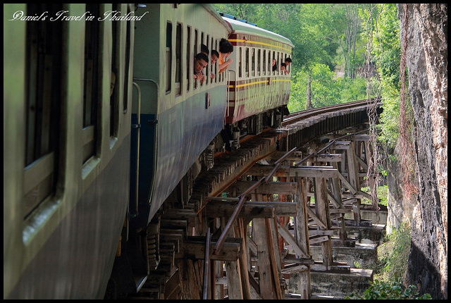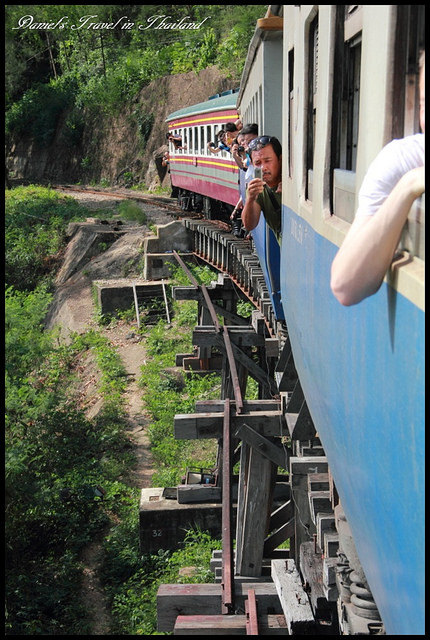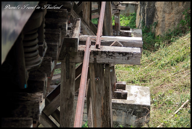 這橋梁均是以木造而製成,細看這些支撐鐵道的木材均已有年代,火車在其上行駛讓我有種不安之感,不知道泰國鐵路局之後會不會將其翻修,不過還好這段死亡鐵路一天車班沒有很多,因此應該還算可以繼續撐下去吧, |