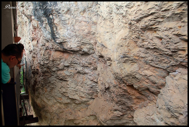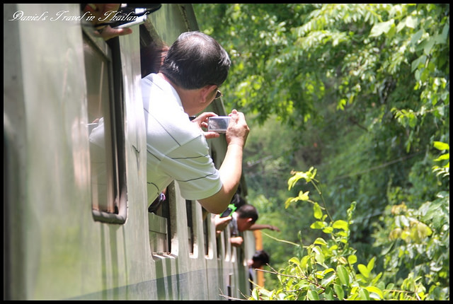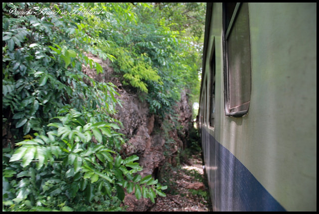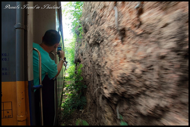 當火車越發靠近死亡鐵路時,全車都傳來一陣驚呼聲,原來我們的火車離山壁是如此靠近,而泰國的火車就像早期台灣的普通號一樣,頭手是可以伸出窗外,因此不少人為了捕捉這些難能可貴的畫面時紛紛將手伸出窗外,過程險象環生, |
