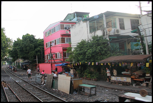 列車緩慢的從曼谷車站駛離,邁向傳說中的北碧死亡鐵路,結果不僅在夜功府的鐵道市場,在曼谷附近也有人民的生活非常貼近鐵道,只是鐵道市場結合的更緊密,這種生活在台灣簡直很難以想像,不過我想其中之一的原因應該是泰國火車的班次不密集之故吧, |