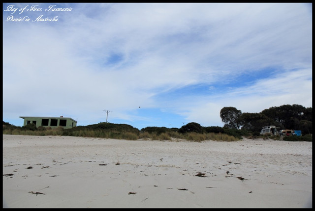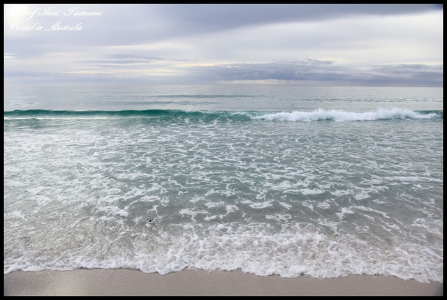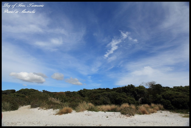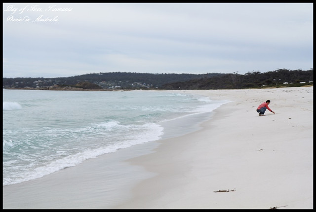 火焰灣的沙灘是屬於細白的白色沙灘,沙灘的砂礫非常細,綿延在塔斯馬尼亞東北部29公里,而塔斯馬尼亞東北部跟其他地方相比,是遊客比較少造訪的區域,雖然天候不佳(但至少是雲層厚而不是烏雲XD),但是還是能感受到火焰灣白色雲層以及細白沙灘交織成渾然天成的寧靜美感,比起第一次只造訪Binalong Bay,這裡的景緻更是令人讚嘆,