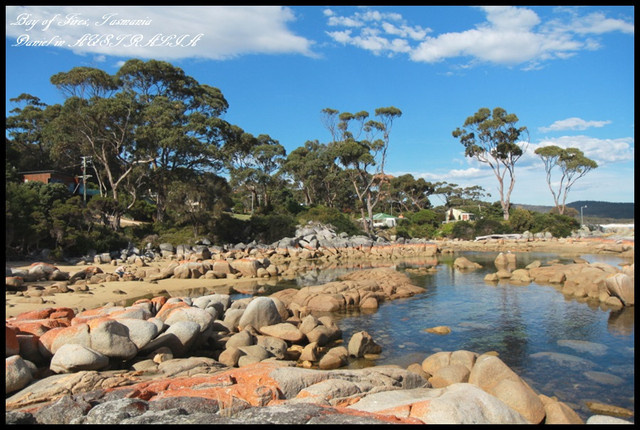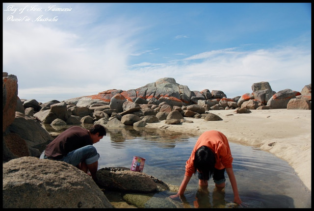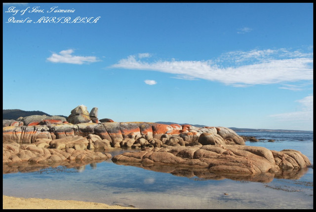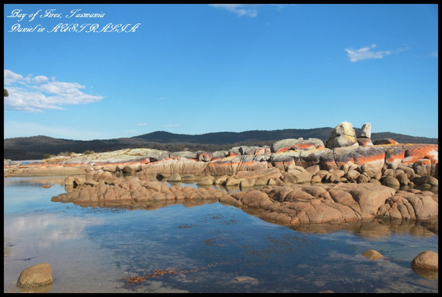 雖然我們Binalong Bay沒有想像中的美,但其實遊客滿少,因此有種自然且恬靜的感受,當天天氣極佳,碧海、藍天加上奇石,也構成了一幅美麗的圖畫,而在寧靜的海面上,火紅的石頭倒映在海面上的景緻也是讓人覺得很奇特,