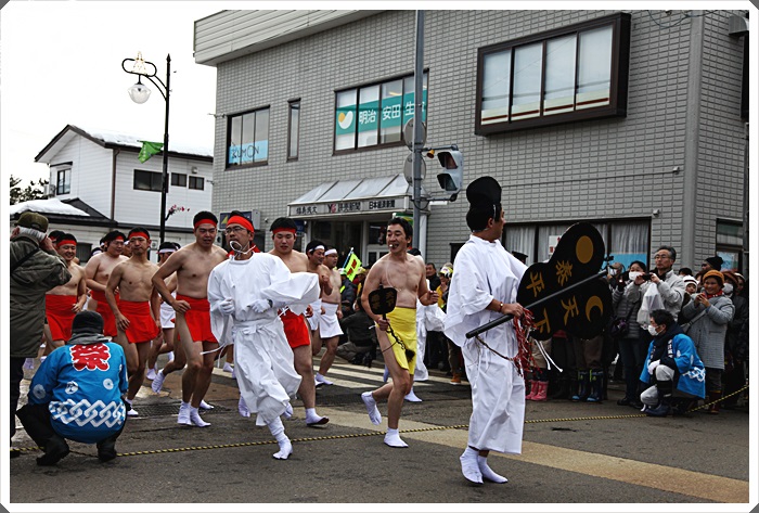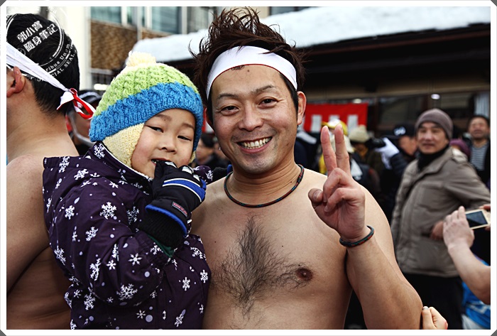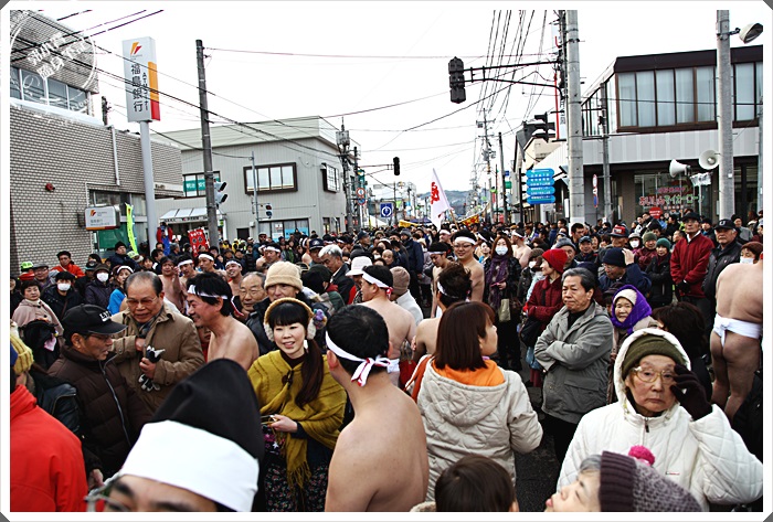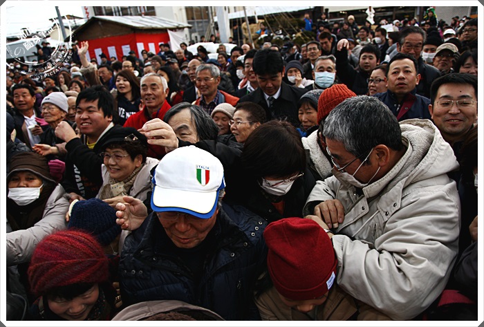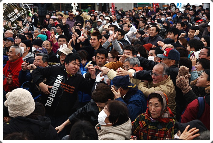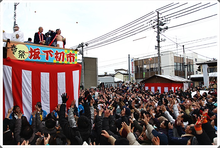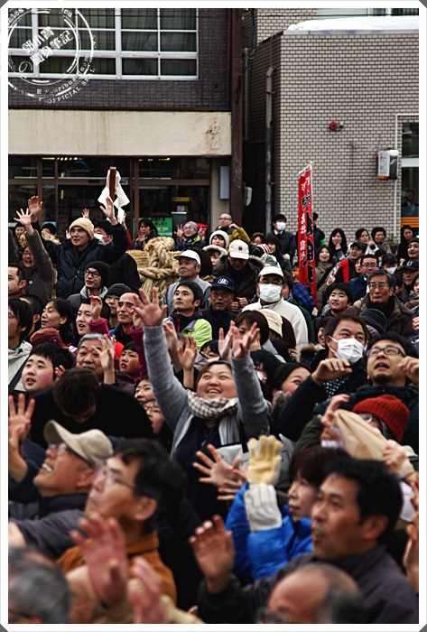 接下來就是坂下初市奇祭的重頭戲了,其實這個有點像台灣普渡完後會灑糖果跟零錢一樣的意思,只是它們丟的是小土俵跟橘子,橘子裡面都有會津坂下町商店家的贈送卷跟割引卷,所以大家都搶得相當的兇,最主要的重點就是大家都要搶到小土俵,因為一年一次活動只會丟365個,代表著365天平安好過運氣滾滾來的意思。 |