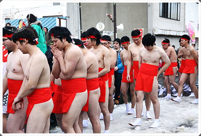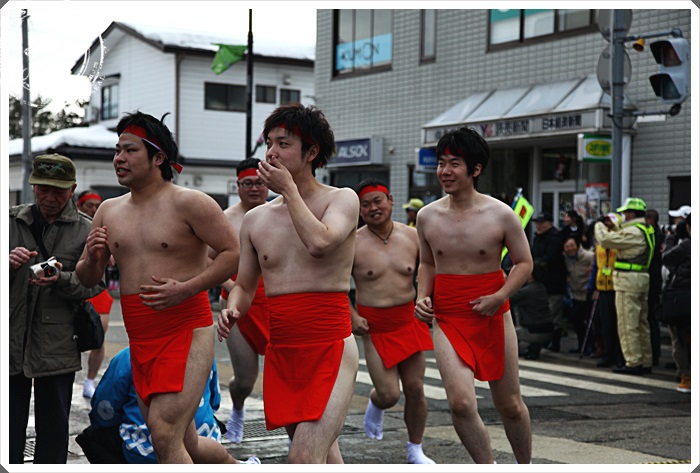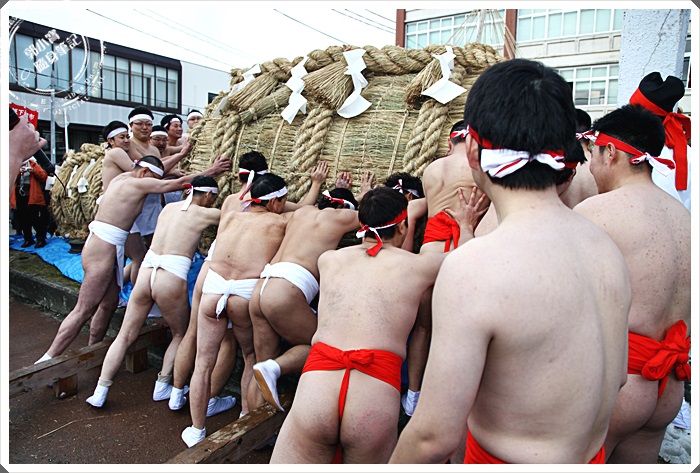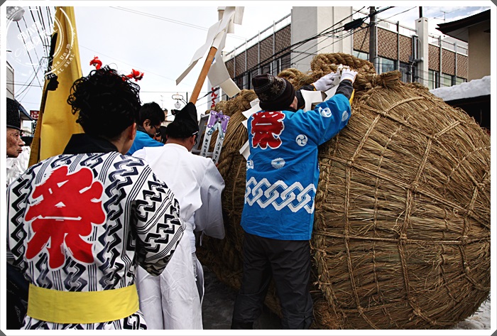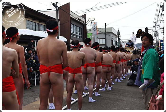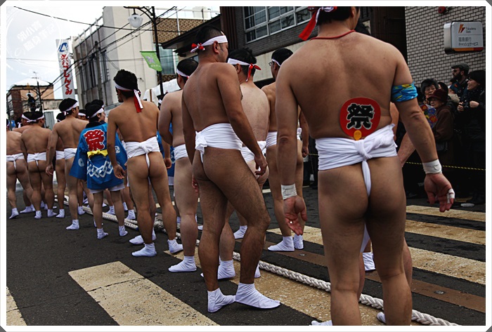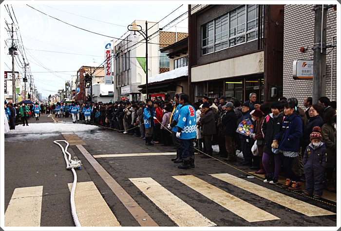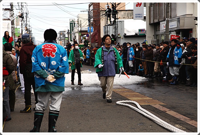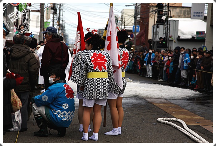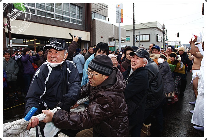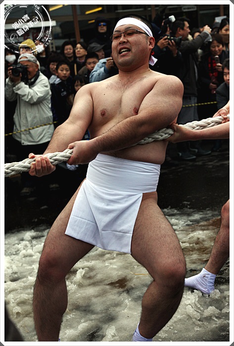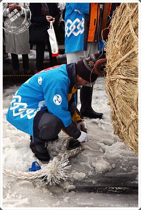 工作人員在馬路中心點的地方鋪上了白雪,在合力將土俵推到雪地上,幫土俵兩邊掛上拔河繩,每一的動作我的熱血就開始沸騰了,其實當天的我穿了三件衣服在套上一件大外套,我都覺得相當的冷了,我很能想像只穿一條丁字褲出現的樣子,重點是我會超害羞的>|||||||||||< |