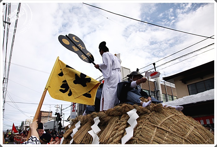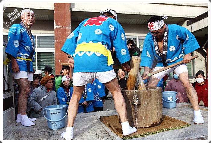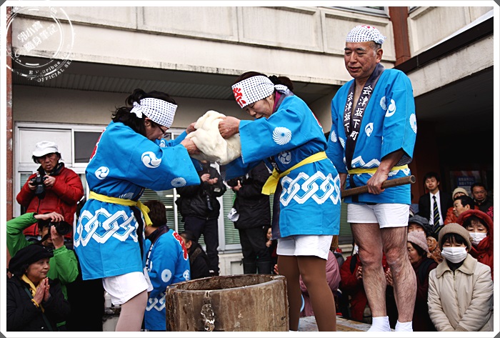 接下來在市役所的門口小舞台上,神官的破酒儀式分送清酒給大家飲用,清酒也是用當地相當知名的地酒,據說喝了會保祐平安之類的,不管發什麼都一堆人搶著要,發完清酒後就是現場搗麻糬,好險因為我站很近,幾乎什麼都拿到吃到喝到XD