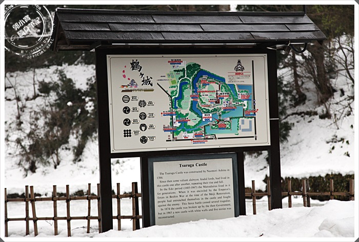 再準備進入真正的鶴ヶ城門口前,可以看到一個立碑上面寫著鶴ヶ城的史跡跟整個鶴ヶ城的平面圖。 |