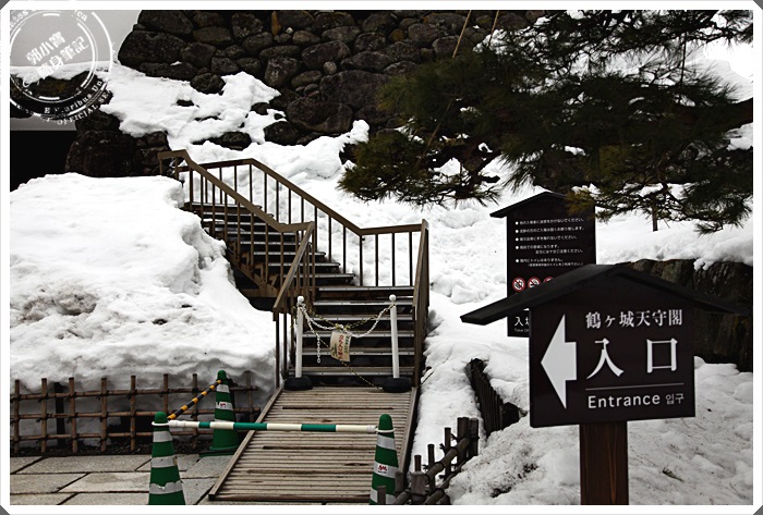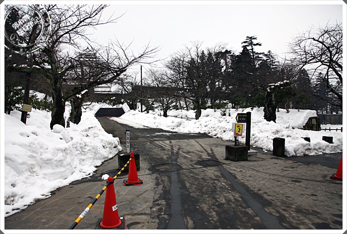 在售票口這邊看若松城就感覺少了一點點,可能因為道路上的白雪需要讓行人行走,所以打掃得相當的乾淨,加上入口處有工程整修,所以整體看起來反而沒有城下的那一張壯觀。 |