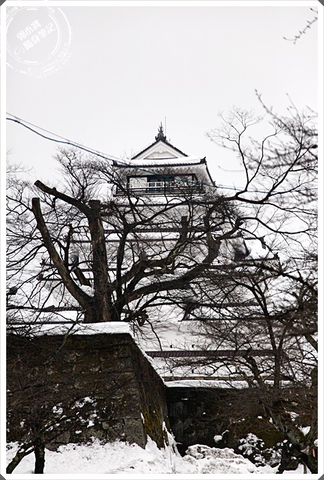 走了大概10分鐘左右就可以隱約看到鶴ヶ城了,就躲在密密麻麻枯枝後面,即使下大雪工作人員也是要把馬路清除的乾乾淨淨的,也幸好有清除的相當乾淨,不然這個小斜坡我們可能會直接摔回房間休息了。 |