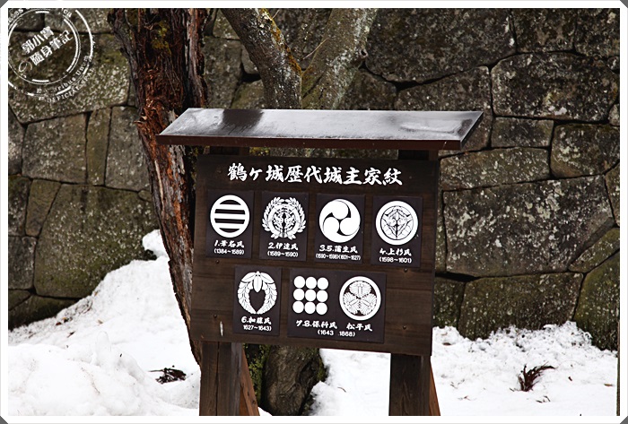 旁邊有個告示牌,上面是7個曾經擁有鶴ヶ城的城主家紋,我惟一比較認為的就是伊達政宗她們的家紋。 |