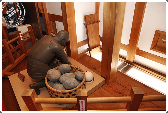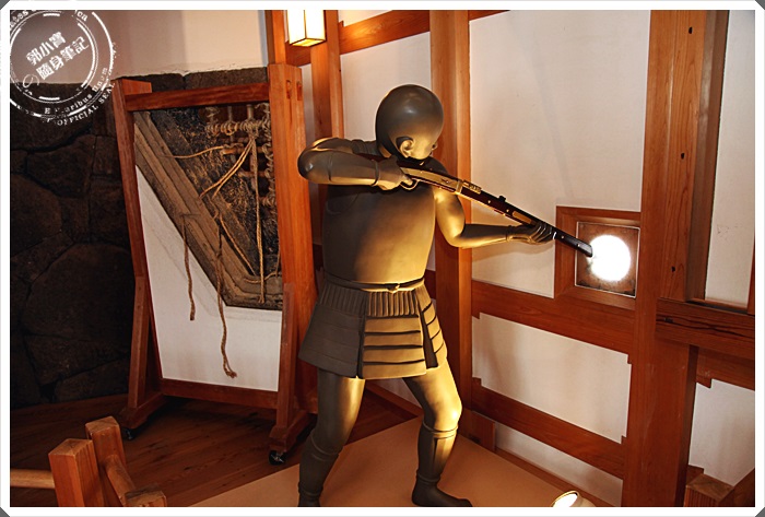 城內還有幾個人像仿造出當初如何防禦天守閣的景象,我對於躲在樓上往下丟石頭這一招感覺到太厲害了,我喜歡這個防守位子XD |
