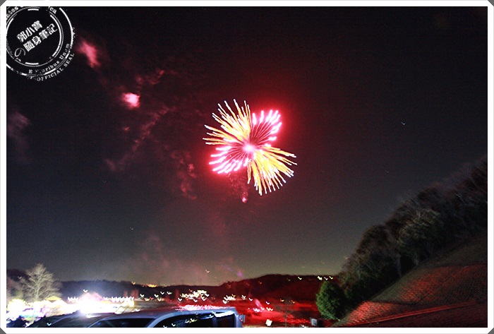 而且我們搶到了一個好位子,因為海報上面寫著每逢假日晚上7點就會放煙火,所以遊客紛紛的往這個山頭走,大家都在想像著煙火如果再光之繪本後面綻放,那真的才是美得像一幅畫,我當下是有生以來第一次覺得懊悔沒有帶腳架,看到其他人都已經架好腳架準備倒數了,我跟朋友則是把相機放在圍籬上盡量固定,我們的位子還超好的耶!!