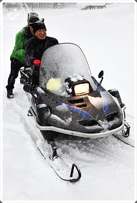 而我們大人們則是挑戰雪上摩托車來一場飆雪競賽,教練先幫我們上了一堂課,如何操作雪上摩托車後,我們就準備上場飆雪了,其實雪上摩托車說簡單也算是相當的簡單,前進後退的動力都有,跟一般騎摩托車差不了多少,但是唯一困難的就是雪層積的太厚的時候,還是盡量避免去使用倒退檔,因為會像汽車卡在泥漿裡面一樣,越陷越深啊!!! |