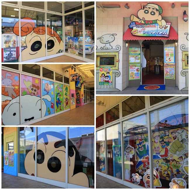 蠟筆小新遊戲館分成兩個部分,一個是成人的賭博館一個是小孩子也可以進入的一般遊戲館,中間有一個小廣場放置了許多蠟筆小新的主題大型公仔。 |
