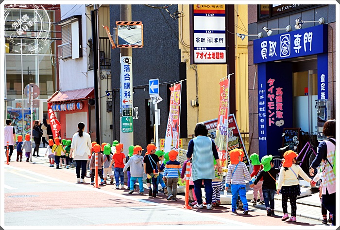 出了車站後走到第一條小街就可以左轉了,直直走就會看到商場,當天早上還遇到一群小朋友呢,彷彿就像是遇到了蠟筆小新的向日葵班,小朋友們都好可愛又守規矩。 |
