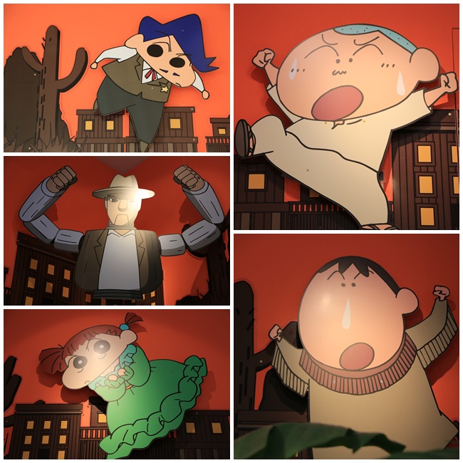 野原一家的大型公仔坐落在一旁,記得來到這邊要常常抬起頭看天花板,天花板也有一些裝飾物唷! |