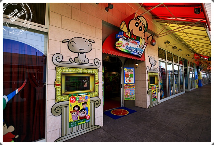 越過長廊後就可以看到另一棟四層高的大樓,這一棟的頂樓就是蠟筆小新遊戲館了,可以看到很多入口處都有著蠟筆小新的掛板!! |