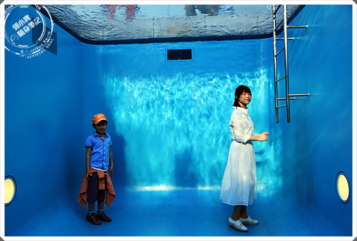 這邊真的是太妙了,因為底部的粉刷是藍色的,加上上面一層淺水跟玻璃的照射,真的有點水波光的悸動,來這邊真的要好好的留念攝影一下,真的彷彿在水底下的世界呢! |