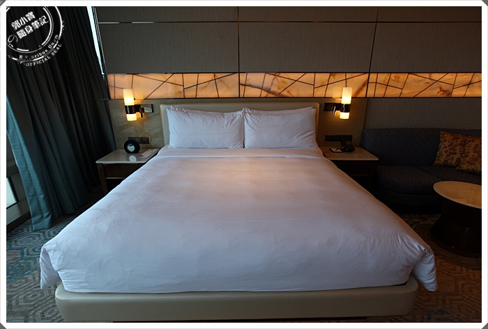 最重要的就是這一張大床了,萬豪酒店的枕頭比較軟,所以各放了四顆讓客人調整,寢具的部分都有太陽暖烘烘的味道,床墊的部分我覺得滿特別的,除了本身的床墊以外,上面還特別加了一層乳膠墊的感覺,睡起來感覺狠硬,但是睡醒來卻不會腰酸背痛,超好睡的,床架延邊也都是棉皮包裹,避免客人撞到腿,床頭兩邊都有燈光中控,重點景觀落地窗的窗簾也是自動的,睡醒拉開出連讓陽光灑在臉上的感覺超舒服。