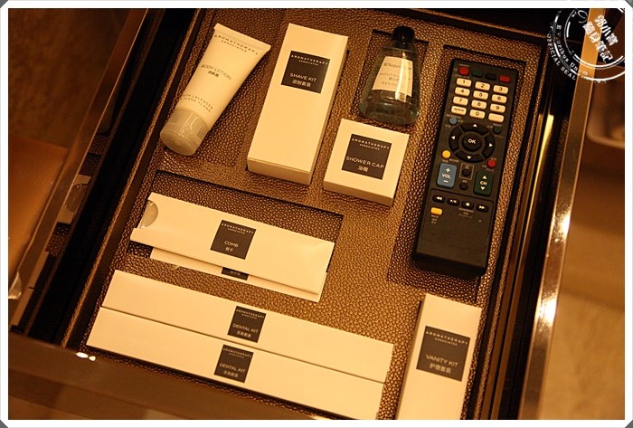 抽屜拉式裡面是皮製的隔板,備品一應俱全,遙控器也在這裡面。 |